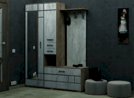 Состоит из полки с крючками, тумбы и шкафа с выдвижной штангой.