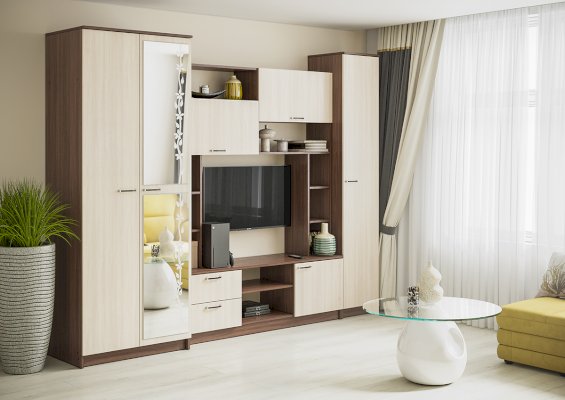 Многофункциональная и практичная гостиная выполнена в современном дизайне. Гостиная состоит из трёх модулей (шкаф платяной, шкаф бельевой, средняя секция)
