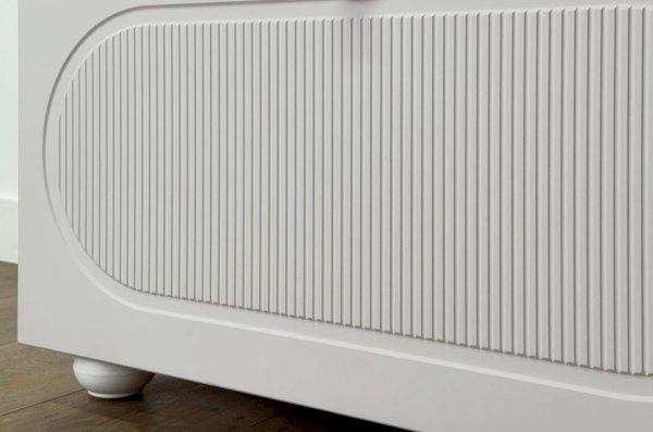 Корпус комода выполнен из ЛДСП толщиной 16 мм, фасады изготовлены из МДФ в плёнке ПВХ. Фасады с фрезеровкой подчёркивают аккуратный внешний вид изделия. Оригинальные круглые ручки и опоры придают комоду современный и лёгкий характер, делая его гармоничной частью детского интерьера.