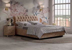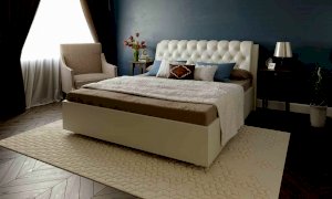 Элегантная интерьерная кровать с изголовьем, украшенным декоративными пуговицами и глубокой пиковкой. Модель изготовлена из ДСП. В комплект кровати входит кроватное основание. Каркас основания выполнен из металла, ламели - из берёзы. При необходимости в комплект можно включить подъемный механизм с бельевым ящиком. Обратная сторона изголовья обита темно-серым спандбондом, но, при желании, её можно выполнить из основного обивочного материала.