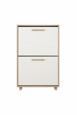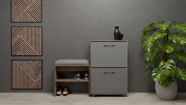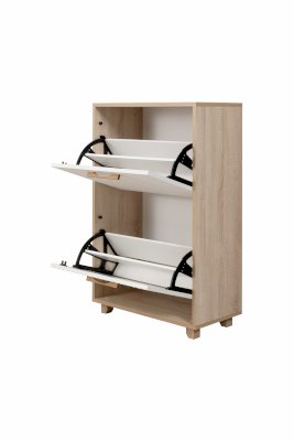 Данная модель обувницы удобна и функциональна в использовании. Конструкцией предусмотрено две закрытых ниши, за откидными дверками которых имеется удобные полочки для обуви.