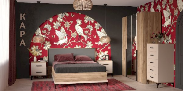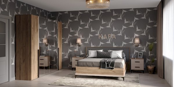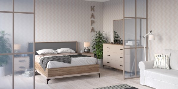 Эффектная двуспальная кровать коллекции КАРА с объемным сборным изголовьем в декоре Антрацит – элегантная модель, которая прекрасно впишется в любой интерьер и станет его визуальной доминантой. Декоративная накладная планка в цвете Велюр по периметру кровати подчеркивает фактурные теплые древесные полутона Дуба Табачного. Сборное изголовье в необычном обрамлении с декоративными «L»- ушками – ещё одна изюминка коллекции. Такое решение в сочетании с высокими ножками выглядит легко и гармонично.
