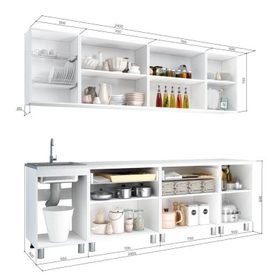 Нижний ряд: шкаф-стол с одним ящиком 500 мм, двухдверный шкаф-стол с одним ящиком 700 мм (2 штуки), шкаф-стол под мойку 500 мм