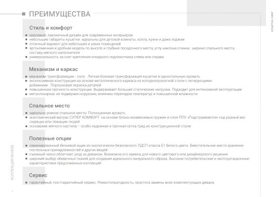 • широкий выбор обивочных тканей для создания идеального визуального образа. Высокие потребительские и эксплуатационные характеристики предложенных коллекций