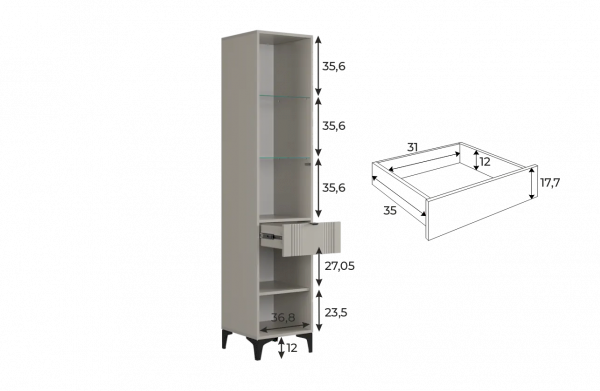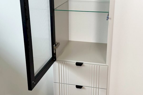 Шкаф оснащён надёжной металлической ручкой и имеет удобное внутреннее наполнение: надёжные полки за стеклянной и глухой дверцами, а также выкатной ящик. Это позволяет рационально использовать пространство.