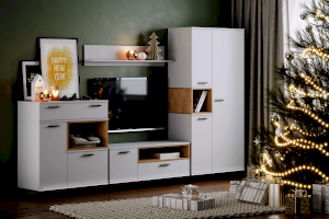 Шкаф оснащен полками за распашными дверками и открытой нишей, которая может быть собрана как на правую, так и на левую стороны, и в ней можно удобно расположить книги или элементы декора, а высокие опоры придают внешнюю легкость и обеспечивают быстрый и легкий доступ во время уборки.