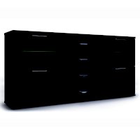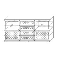 Комодино состоит из 3-х секций. Центральная комплектуется 4-мя ящиками на телескопических шариковых направляющих полного выдвижения с декором в центральных частях фасадов. Боковые секции делятся на две части. Верхние закрыты фасадами с тонированными стеклами, за которым располагаются стеклянные полки, а нижние — глухими с декоративными вставками из экокожи caiman темного цвета.