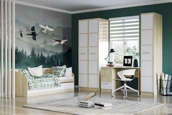 Шкаф «Фанк» предназначен для тех, кто любит выдержанный стиль. Идеально для организации подростковой комнаты. А универсальный дизайн и цветовое решение подойдет как для мальчика, так и для девочки. Отделение с 2-мя штангами позволит удобно развесить большое количество одежды на вешалках. Наличие полок позволит рассортировать одежду и поставить коробки. Два выдвижных ящика предназначены для сложенной одежды, аксессуаров, личных вещей.